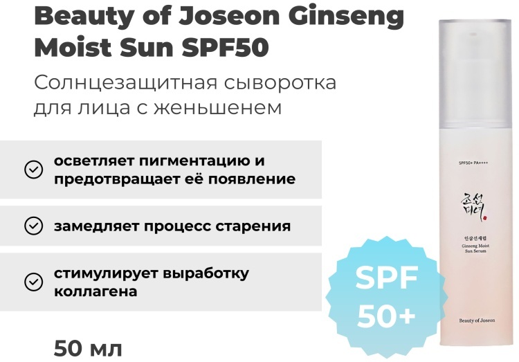 Солнцезащитная сыворотка Beauty of Joseon Ginseng Moist Sun Serum SPF50+ PA++++ с лёгкой текстурой — средство 2-в-1 для ухода за кожей и защиты от солнца. Защищает от вредного воздействия ультрафиолета, омолаживает и поддерживает эластичность.