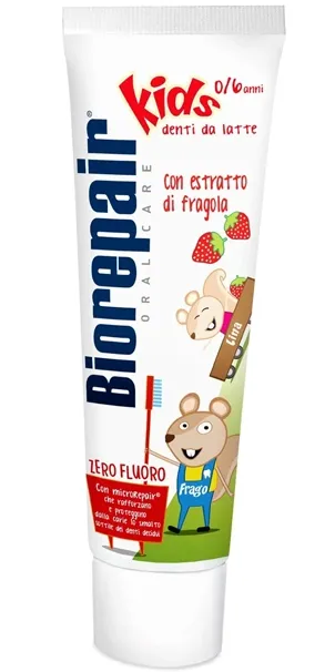 Biorepair Kids 0-6 лет с экстрактом земляники — это мягкая детская зубная паста, разработанная специально для малышей от 0 до 6 лет, которая помогает укреплять эмаль молочных зубов, защищать её от кариеса и поддерживать здоровье десен. Благодаря технологии microRepair® — микрочастицам гидроксиапатита, похожим по составу на естественную эмаль и дентин — паста заполняет микротрещины эмали, способствует её реминерализации и делает зубы более устойчивыми к воздействию кислот, образующихся после еды. Формула содержит экстракт земляники, который придаёт приятный фруктовый вкус, делает чистку зубов более привлекательной для ребёнка и помогает тонизировать и питать нежные десны.